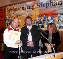 Der neue Erste Vorstand, Stefan Mayer, ernannte den sichtlich gerührten Hans Brucker als Dank für dessen Engagement und unentbehrlichen Dienste, die dieser seit 38 Jahren leistet, zum Ehrenmitglied des Spielmannszuges.