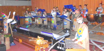 Nach der Pause kam der große Auftritt des Spielmanns-Nachwuchses. Eine wilde Indianerhorde erstürmte unter lautem Kriegsgeheul die magisch beleuchtete Bühne, um die Zuschauer mit dem „Tomahawk Dance“ zu verzaubern. Plötzlich stand Dirigentin Susanne Brucker am Marterpfahl gefesselt vor der Bühne und wartete auf Hilfe. Zum Glück konnte Hans Brucker seine Frau Susanne rasch befreien und wurde von ihr mit einem liebevollen Kuss für die Rettung belohnt. Die Nachwuchstrommlerin Lilly aus der wilden Indianerhorde feierte an diesem Tag ihren Geburts- tag und erhielt eine kleines Präsent überreicht.